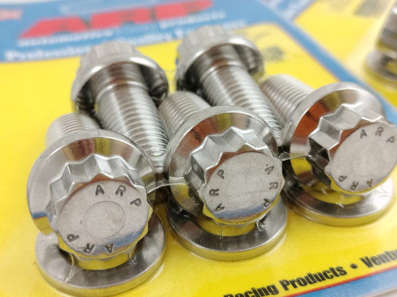 Un altro componente del motore che viene sottoposto a notevole stress è il volano, con tutto il sistema frizione che trasmette la coppia erogata dal motore al cambio ed alla trasmissione della vettura. Tutta la preparazione e l'incremento di prestazioni deve passare dall'albero motore al cambio per poter poi arrivare alle ruote e poter essere sfruttato. Ciò che unisce il volano, con il sistema di frizione utilizzato, all'albero motore sono i bulloni volano. Da qui si capisce lo sforzo e le sollecitazioni che questi devono subire. Accelerazione, cambi marcia, scalate, tutto passa attraverso questi 6/8 bulloni.... L'importanza di avere il massimo dell'affidabilità e della resistenza di questi fissaggi porta inevitabilmente all'adozione di bulloni speciali ARP per il montaggio ed il fissaggio del volano all'albero motore. Vengono venduti diversi kit specifici per vetture oppure con le misure dei bulloni originali, ARP mette a disposizione tutta una serie di bulloni differenti per lunghezza, diametro e passo del filetto da poter essere adattati allo specifico montaggio richiesto. Come al solito questa bulloneria