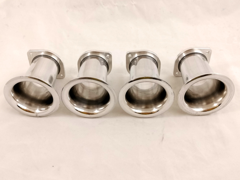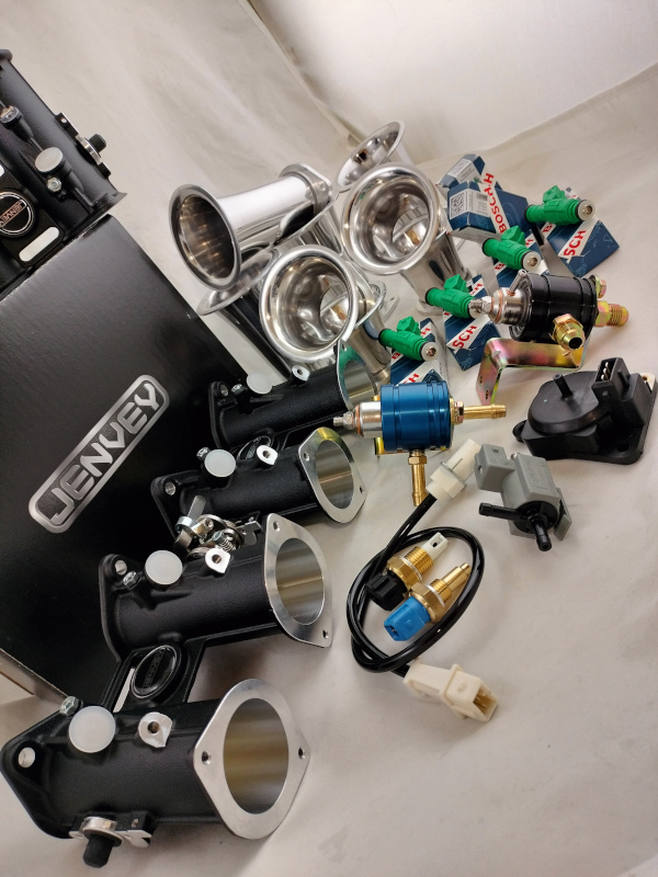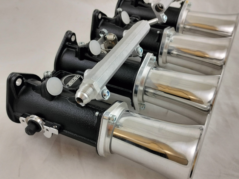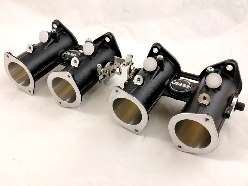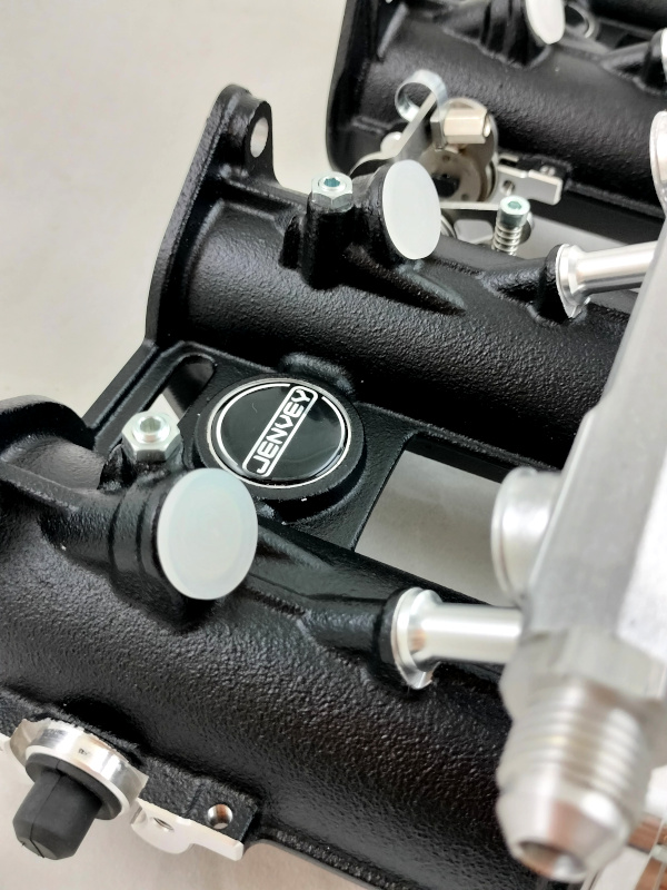La maggior parte dei kit di aspirazione Jenvey ha la flangia di collegamento che si adatta perfettamente ai sistemi di fissaggio dei carburatori, non è quindi necessario, nella maggior parte dei casi, la sostituzione del collettore di aspirazione. Qui sopra si possono vedere 2 doppio corpo Jenvey che vanno perfettamente ad installarsi sui collettori nati per i carburatori orizzontali Weber DCOE. Che si tratti di una conversione ad iniezione di un vecchio motore a carburatore oppure l'aggiornamento di un motore più moderno l'adozione di un collettore di aspirazione con la classica flangia per carburatori, che siano del tipo orizzontale o verticale, semplifica di molto l'installazione. Jenvey produce un gran numero di collettori per completare i suoi kit di aspirazione per quei motori che in origine montano collettori mono farfalla non adattabili all'installazione delle farfalle singole. Per alcune specifiche applicazioni i collettori di aspirazione vengono costruiti appositamente.