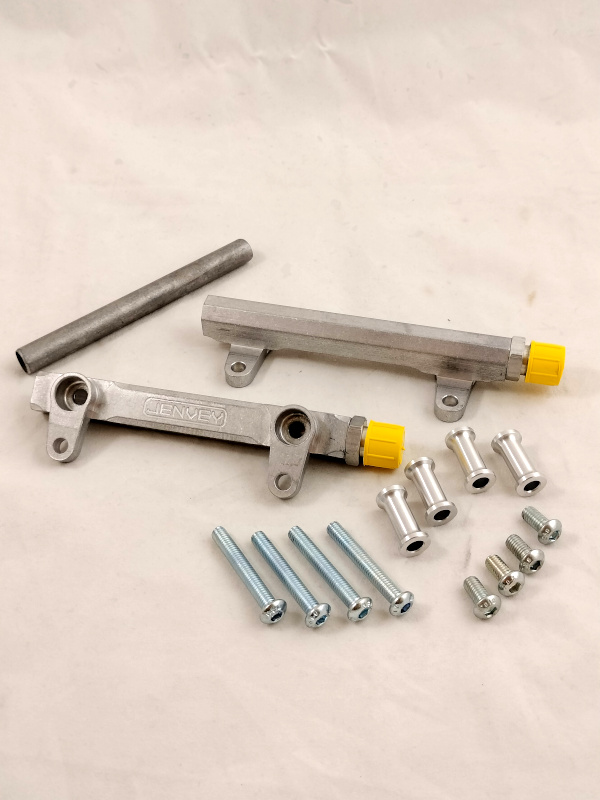 Flauto rail per collegamento linea benzina ed iniettori. Jenvey da la possibilità di installare rail in acciaio per la distribuzione della benzina agli iniettori elettronici oppure si possono montare anche flauti in alluminio ricavati dal pieno. La versione più utilizzata sulle vetture da competizione prevede l'adozione dei raccordi aeronautici AN6 per garantire la massima sicurezza e una buona portata nel caso di motori prestazionali. Si possono avere anche con porta gomma per utilizzare il classico tubo benzina e fascetta. I kit Jenvey vengono completati con i rail benzina ma possono essere anche acquistati separatamente per altre applicazioni. Fuel Rail Jenvey