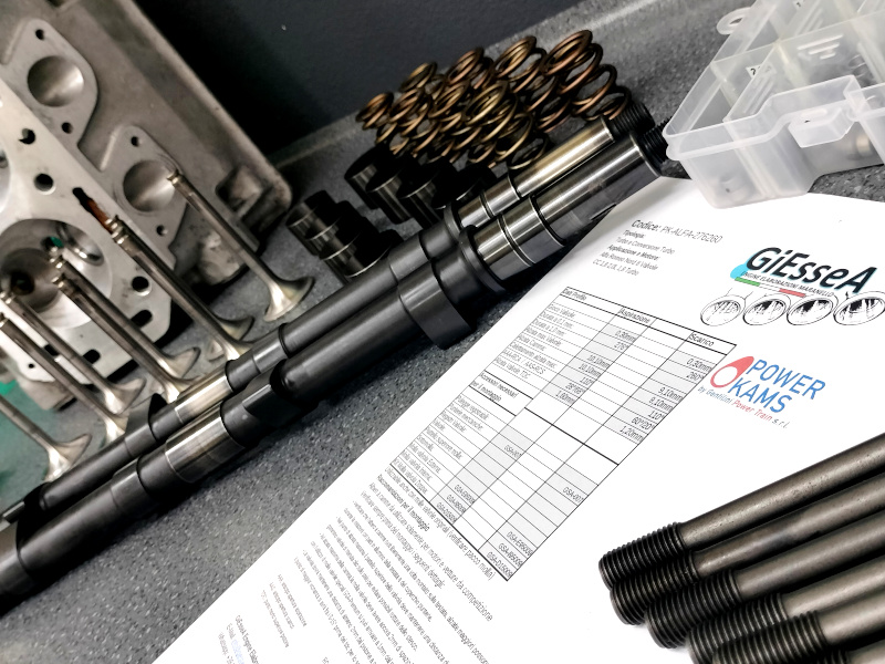 Componenti speciali per Elaborazione e Preparazione motori Aspirati e Turbo. Alfa Romeo Alfetta GTV Turbo Delta 2.0 8 Valvole, gli stessi componenti e accessori possono esse utilizzati per la preparazione del motore Alfa Romeo 75 1.8 Turbo. Profili di Alberi a Camme by PowerKams appositamente studiati per la preparazione di questo motore Turbo compresso realizzati con i migliori materiali e trattamenti, utilizzabili con molle originali e punterie di serie permettono un notevole incremento di coppia e prestazioni. Profili di Camme per Alfa Romeo. Per l'utilizzo di Alberi a Camme PowerKams con profilo più spinto abbiamo disponibili dei kit completi di molle valvole rinforzate e punterie meccaniche leggere con trattamento DLC. Le punterie sono utilizzabili al posto delle originali nel caso quelle presenti sul motore risultassero deteriorate anche senza la sostituzione delle molle valvole. Sempre disponibili in fine, per completare la parte alta motore, registri valvole a cappuccio per valvole stelo 8mm, 7mm, 6mm, 5mm. Disponibili anche valvole maggiorate in Acciaio o Inconel per preparazioni o per sostituzione alle originali.