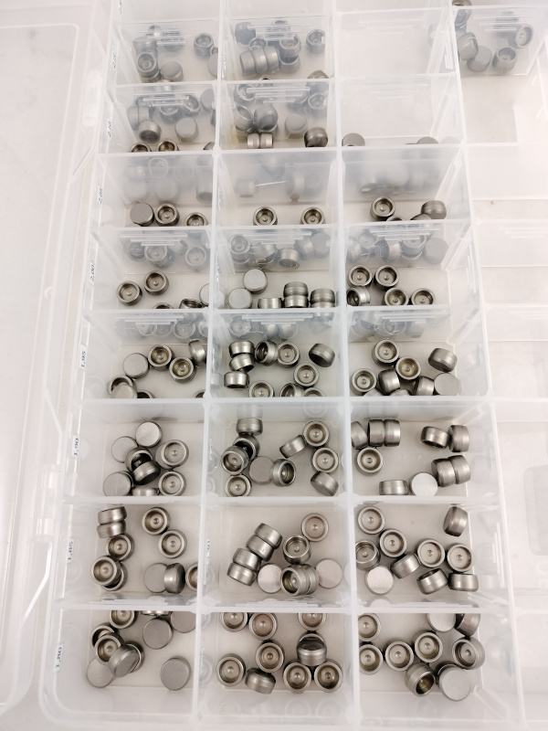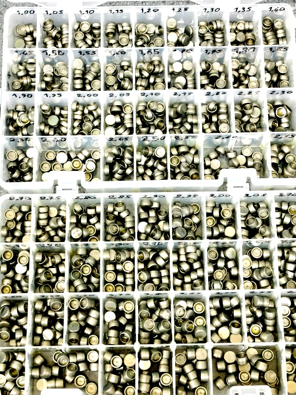 Registri valvole leggeri tipo Maserati per regolazione gioco valvole con punterie meccaniche. Lash Caps utilizzabili sullo stelo della valvola per la registrazion del corretto gioco di funzionamento fra punteria e albero a camme. Utilizzabili per la registrazione su motori che già hanno punterie meccaniche, tipo Maserati Alfa Romeo Ford, oppure nel caso di sostituzione delle punterie idrauliche con punterie meccaniche leggere per la preparazione di motori da competizione. I registri valvole vengono prodotti con materiali di prima scelta per garantire affidabilità e massima resistenza agli stress che dovranno subire. Vengono inseriti sulla sommità dello stelo dalla valvola per adeguare il gioco di funzionamento fra punteria ed Albero a Camme. Hanno spessore calibrato e si possono utilizzare su valvole con stelo diametro 6 mm, 7 mm, 8 mm e 9 mm. La guida di 2,5 mm che va a lavorare sulla sommità dello stelo della valvola garantisce la miglior stabilità possibile per utilizzi fino ad 8500 rpm, in caso di fuorigiri e leggero distacco della punteria dal profilo del cam assicura che la pastiglietta non possa uscire dalla sua posizione. Per utilizzi particolari si possono produrre registri valvole con guida da 4mm.